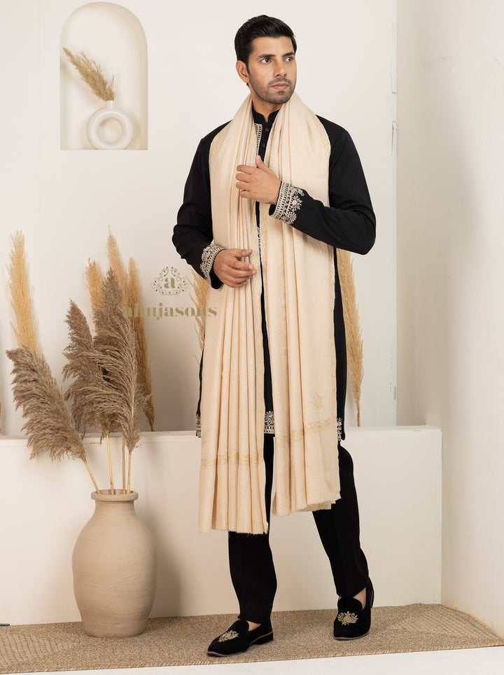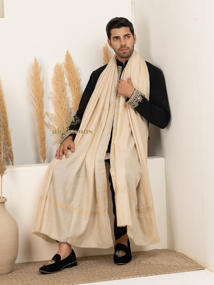 This Handloom Pure Pashmina Shawl in Beige for Men's is tailored for regular elegance. Crafted from fine Handloom Pure Pashmina, it features a refined that stands out effortlessly. The silhouette in Beige makes it a distinctive wardrobe addition. This exquisite men's Handloom Pure Pashmina shawl blends traditional charm with a modern aesthetic. Perfect for layering or wearing solo, it adds grace and warmth to every look. From cultural occasions to casual affairs, it adapts with timeless style and poise. An ideal choice for those who appreciate quality and artistic expression. The rich texture and finish make it a keepsake for any season. Experience effortless elegance with its flowing drape and captivating detailing. A must-have that redefines sophistication through subtle artistry and comfort.