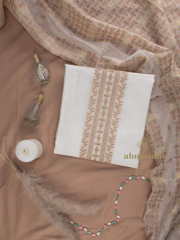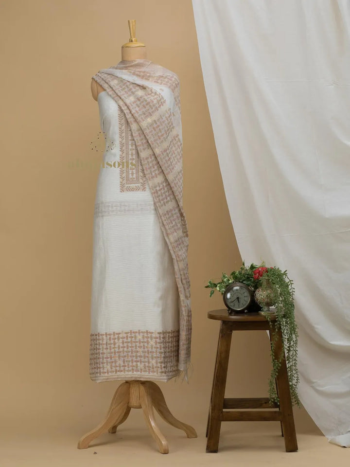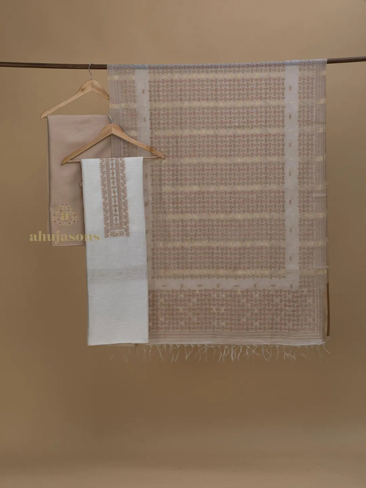 This Classic White & Beige Cotton silk suit with zari weaving Drapery is tailored for regular elegance. Crafted from fine cotton silk, it features a refined suits that stands out effortlessly. The unstitched suit silhouette in white makes it a distinctive wardrobe addition. This exquisite unstitched suit blends traditional charm with a modern aesthetic. Perfect for layering or wearing solo, it adds grace and warmth to every look. From cultural occasions to casual affairs, it adapts with timeless style and poise. An ideal choice for those who appreciate quality and artistic expression. The rich texture and finish make it a keepsake for any season. Experience effortless elegance with its flowing drape and captivating detailing. A must-have that redefines sophistication through subtle artistry and comfort.
