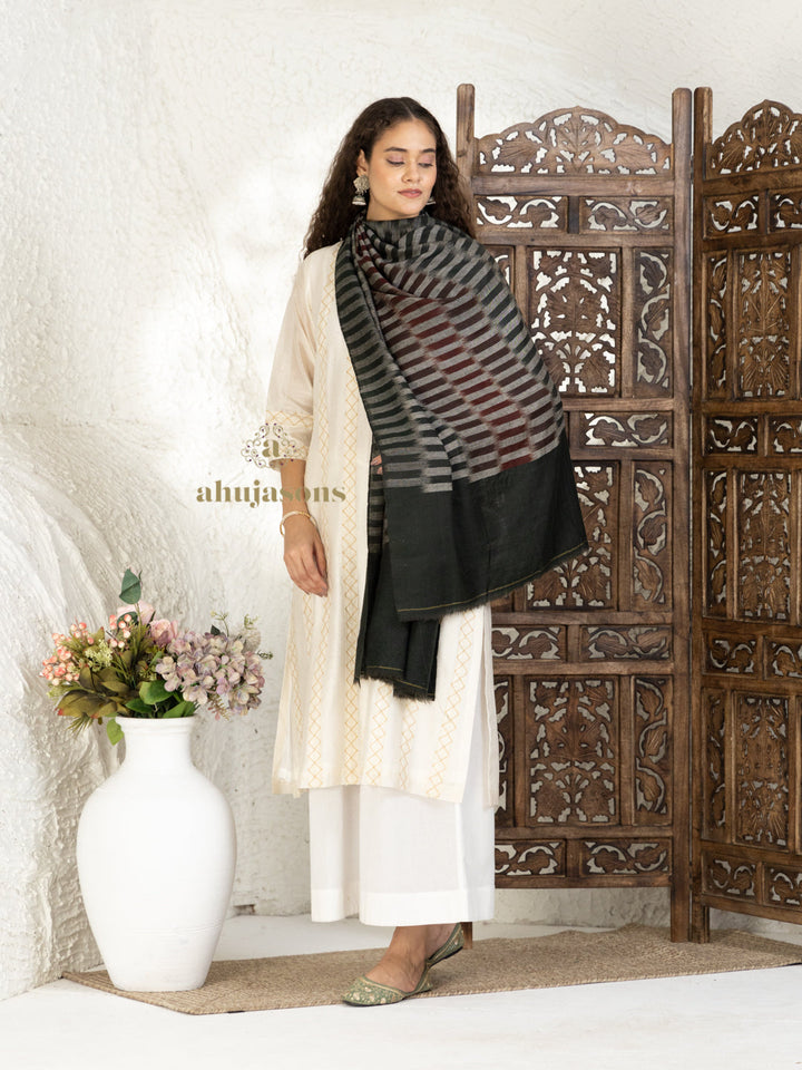 Elevate your ensemble with the charm of the Black Handloom Pure Pashmina Stole showcasing elegant Ekat Stole, a perfect blend of heritage weaving and contemporary finesse, exuding royal allure. A luxurious piece that defines grace and opulence for every occasion.