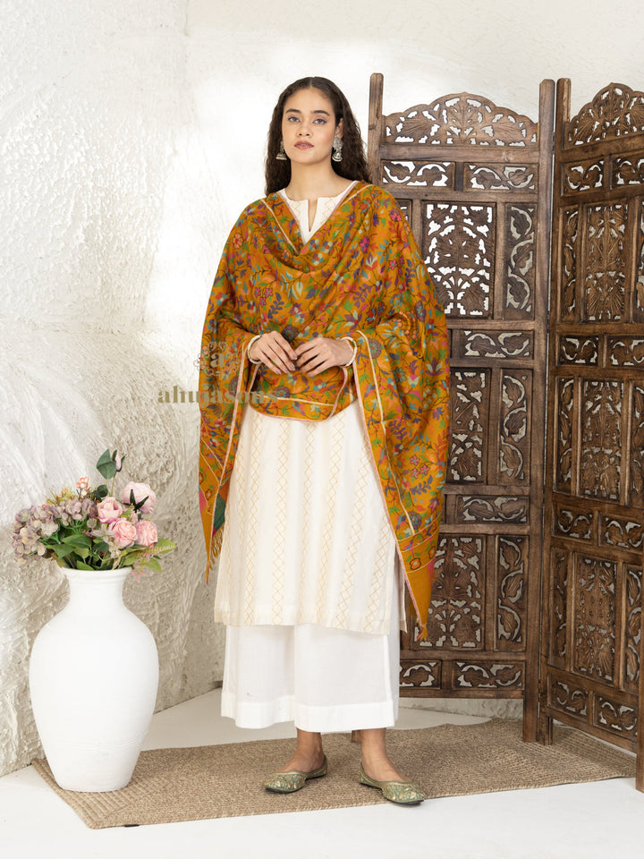 Elevate your ensemble with the charm of the Yellow Handloom Pure Pashmina Stole adorned with masterful Kani Stole detailing, infused with timeless tradition, making it an icon of understated glamour. A luxurious piece that defines grace and opulence for every occasion.