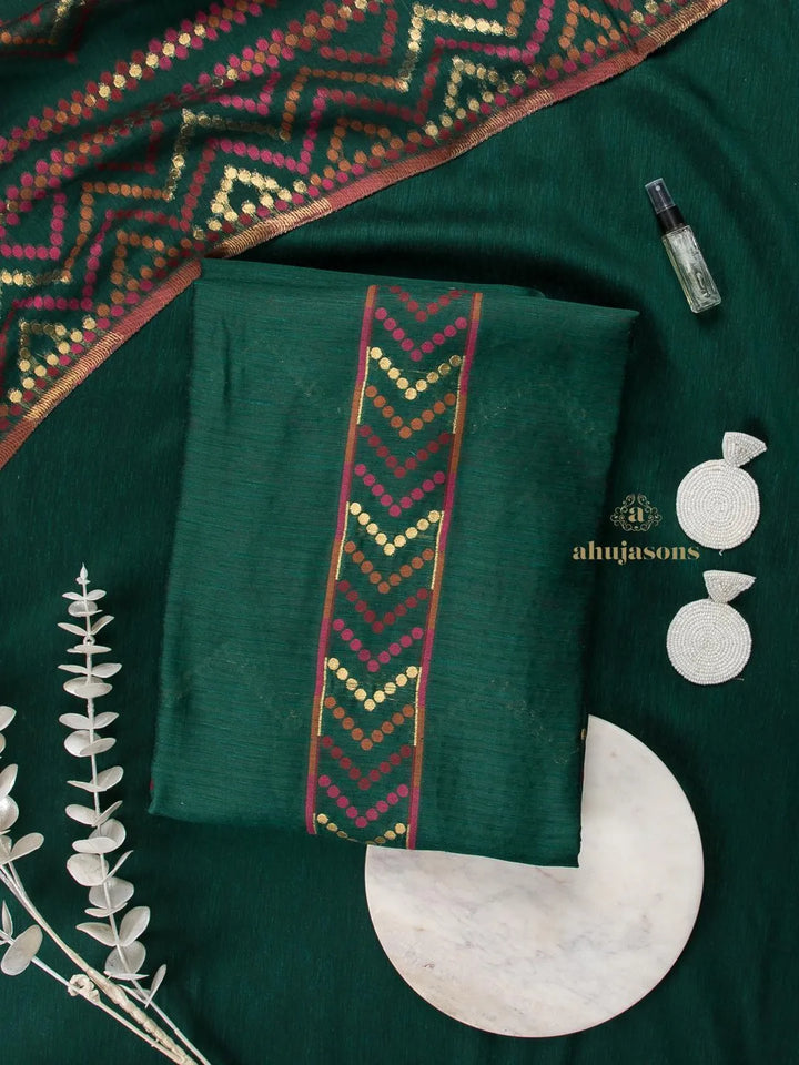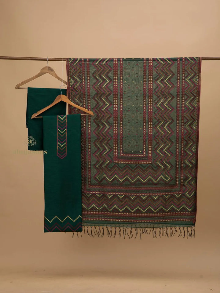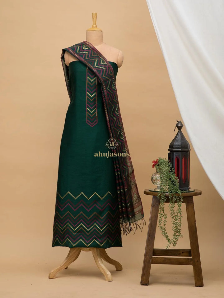 This Opulent Green Cotton Silk Suit With Zari Weaving Appeal is tailored for regular elegance. Crafted from fine cotton silk, it features a refined suits that stands out effortlessly. The suits silhouette in green makes it a distinctive wardrobe addition. This exquisite unstitched suit blends traditional charm with a modern aesthetic. Perfect for layering or wearing solo, it adds grace and warmth to every look. From cultural occasions to casual affairs, it adapts with timeless style and poise. An ideal choice for those who appreciate quality and artistic expression. The rich texture and finish make it a keepsake for any season. Experience effortless elegance with its flowing drape and captivating detailing. A must-have that redefines sophistication through subtle artistry and comfort.