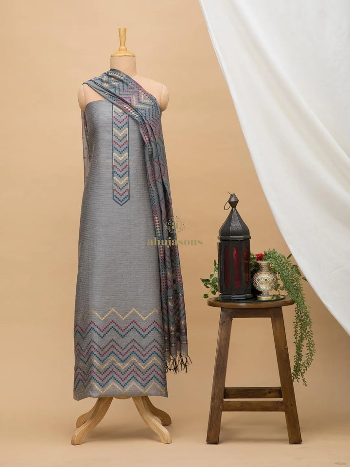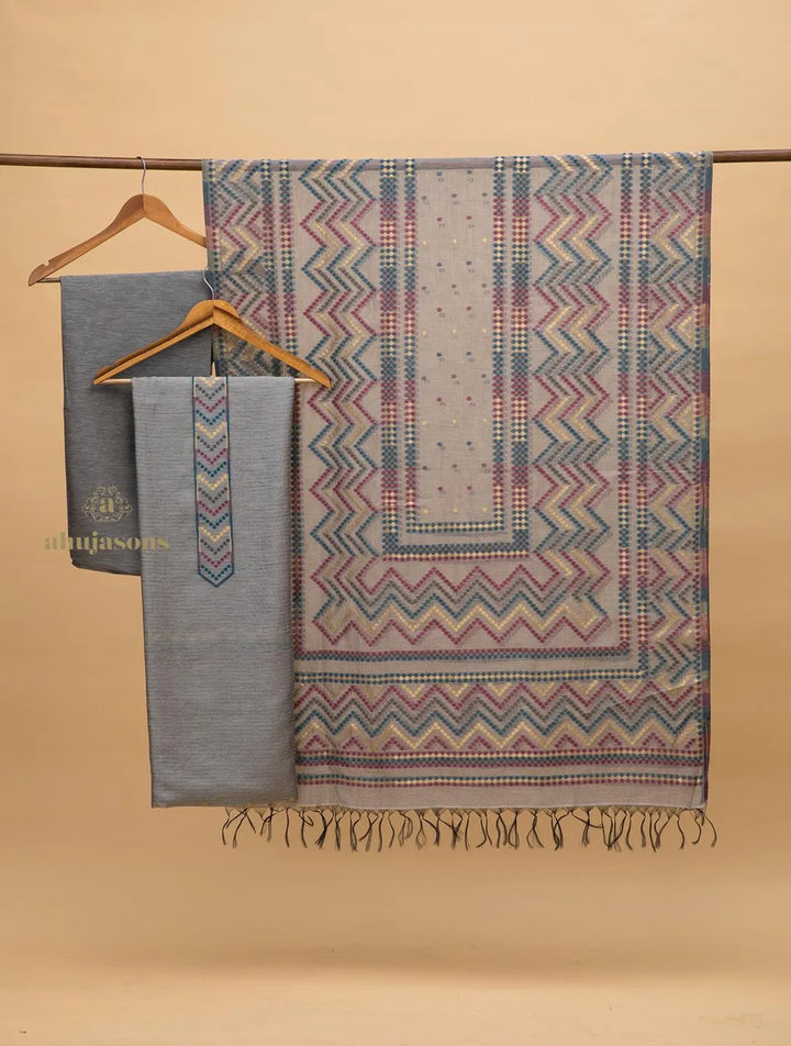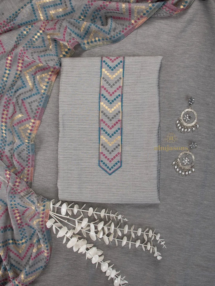 This Refined Grey Cotton silk suit with zari weaving Selection is tailored for regular elegance. Crafted from fine cotton silk, it features a refined suits that stands out effortlessly. The unstitched suit silhouette in grey makes it a distinctive wardrobe addition. This exquisite unstitched suit blends traditional charm with a modern aesthetic. Perfect for layering or wearing solo, it adds grace and warmth to every look. From cultural occasions to casual affairs, it adapts with timeless style and poise. An ideal choice for those who appreciate quality and artistic expression. The rich texture and finish make it a keepsake for any season. Experience effortless elegance with its flowing drape and captivating detailing. A must-have that redefines sophistication through subtle artistry and comfort.