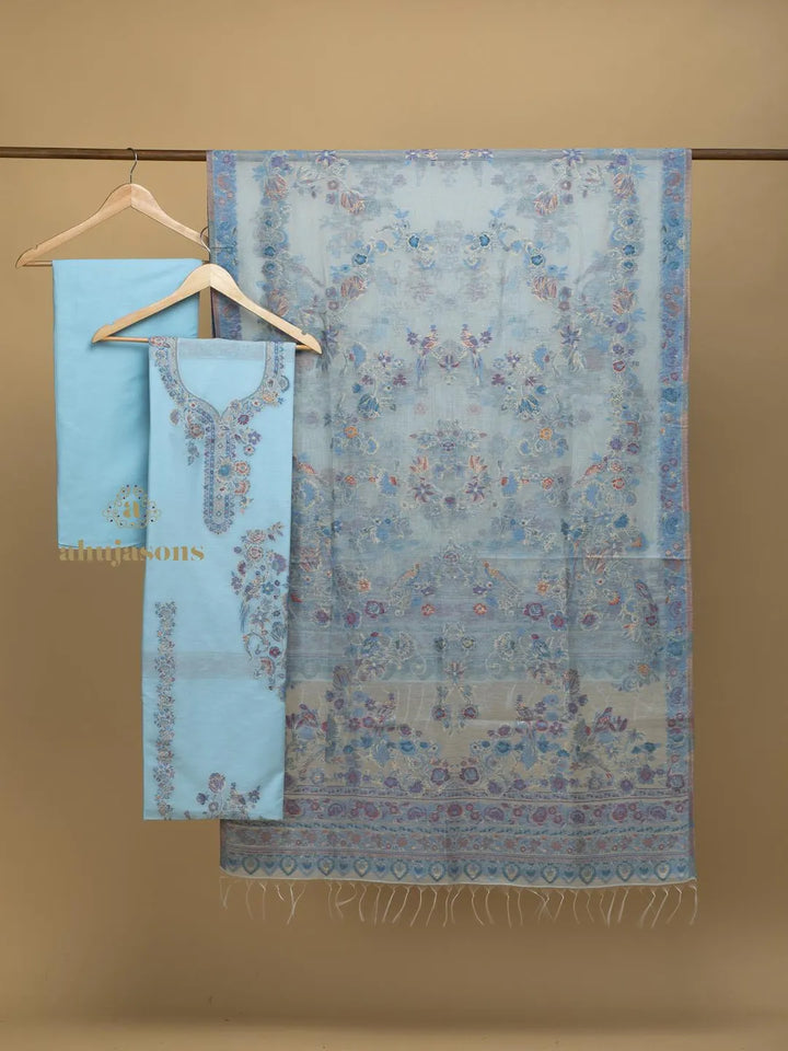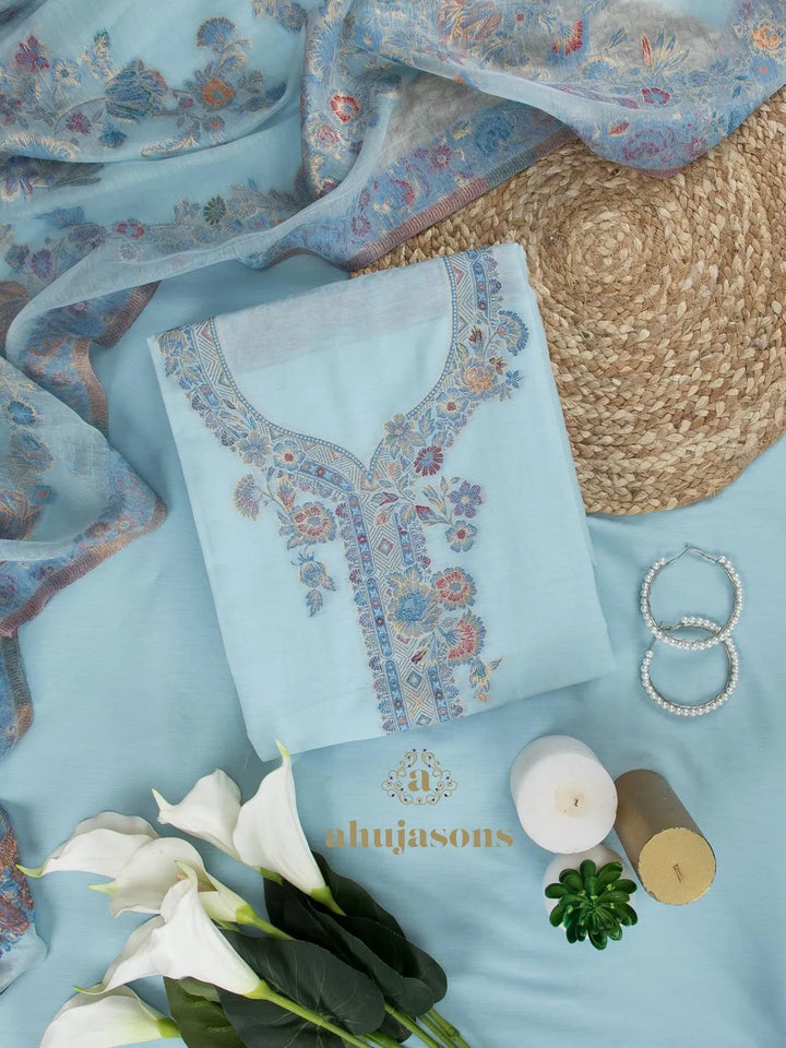 This Refined Light Blue Cotton silk suit with zari weaving Selection is tailored for regular elegance. Crafted from fine cotton silk, it features a refined suits that stands out effortlessly. The unstitched suit silhouette in light blue makes it a distinctive wardrobe addition. This exquisite unstitched suit blends traditional charm with a modern aesthetic. Perfect for layering or wearing solo, it adds grace and warmth to every look. From cultural occasions to casual affairs, it adapts with timeless style and poise. An ideal choice for those who appreciate quality and artistic expression. The rich texture and finish make it a keepsake for any season. Experience effortless elegance with its flowing drape and captivating detailing. A must-have that redefines sophistication through subtle artistry and comfort.