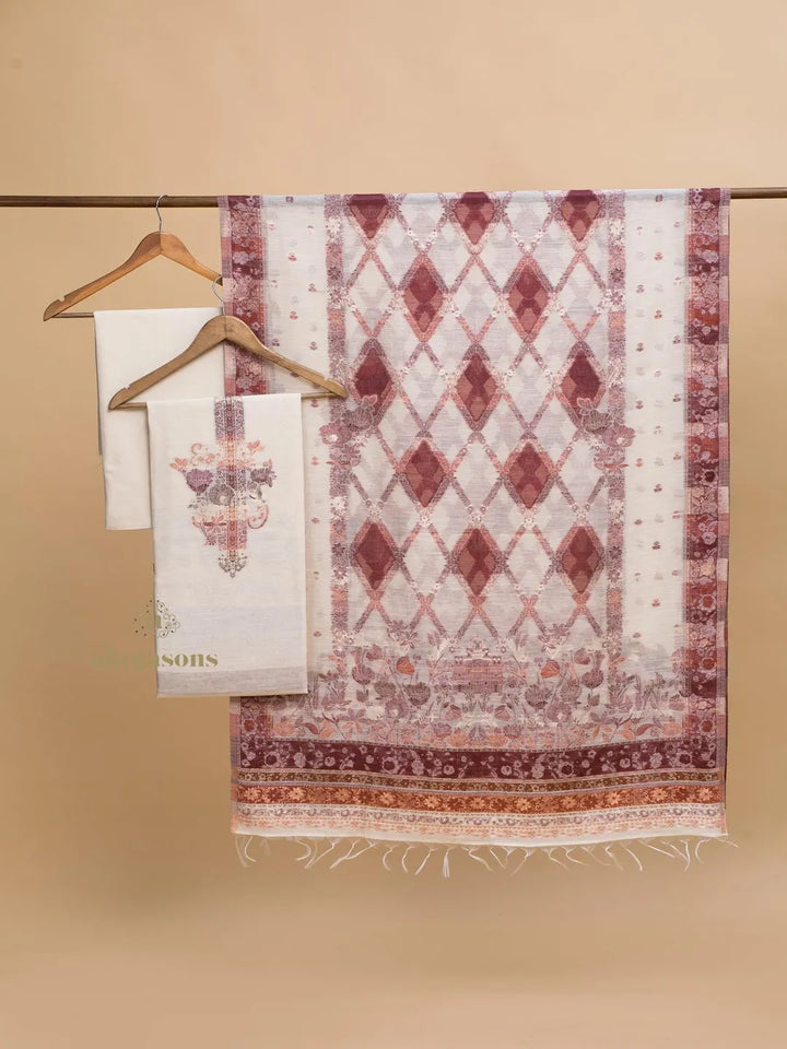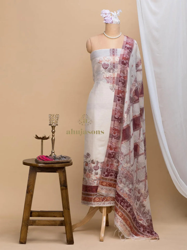 This Timeless White & Maroon Cotton silk suit with zari weaving Elegance is tailored for regular elegance. Crafted from fine cotton silk, it features a refined suits that stands out effortlessly. The unstitched suit silhouette in white makes it a distinctive wardrobe addition. This exquisite unstitched suit blends traditional charm with a modern aesthetic. Perfect for layering or wearing solo, it adds grace and warmth to every look. From cultural occasions to casual affairs, it adapts with timeless style and poise. An ideal choice for those who appreciate quality and artistic expression. The rich texture and finish make it a keepsake for any season. Experience effortless elegance with its flowing drape and captivating detailing. A must-have that redefines sophistication through subtle artistry and comfort.