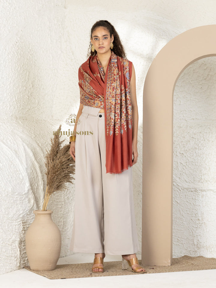 Immerse yourself in the splendor of the Orange Woollen Stole featuring Border Embroidery With Jaal Woollen Stole, a perfect blend of heritage weaving and contemporary finesse, exuding royal allure. Perfect for women who appreciate refined fashion with cultural depth.