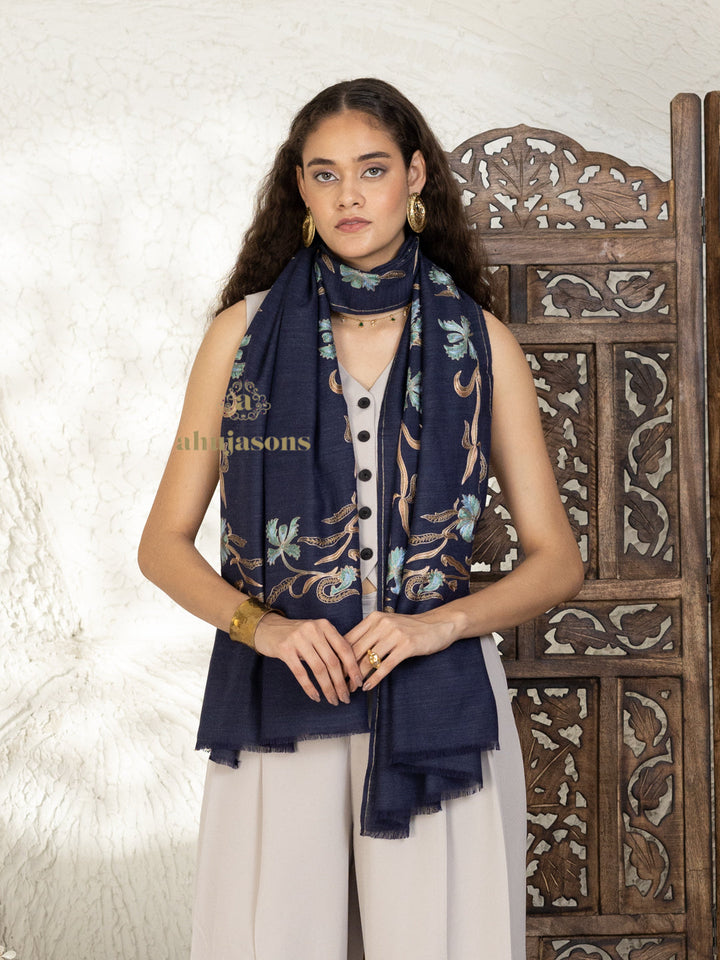 Drape yourself in the soft luxury of the Navy Blue Woollen Stole accented by sublime Border Embroidery Woollen Stole, crafted from the finest handloom pashmina, offering unrivaled warmth and sophistication. A luxurious piece that defines grace and opulence for every occasion.