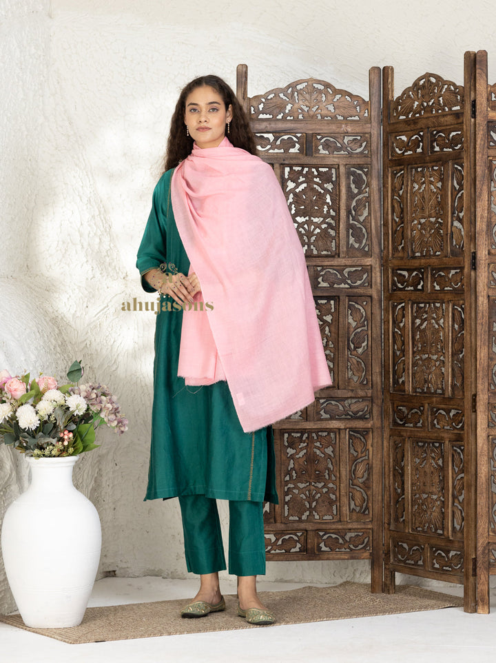 Drape yourself in the soft luxury of the Pink Woollen Stole highlighted by sublime Solid Woollen Stole, handwoven by skilled Kashmiri artisans, a reflection of authentic elegance and heritage. Perfect for women who appreciate refined fashion with cultural depth.